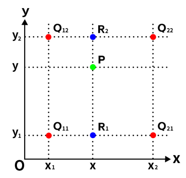 - 如上图,四个Q点是原图中间隔P点近来的四个点,起首将P投影到程度方向上,对两个R点分别举行一次程度线性插值,再在竖直方向上对两个R点举行线性插值得到P点的像素值