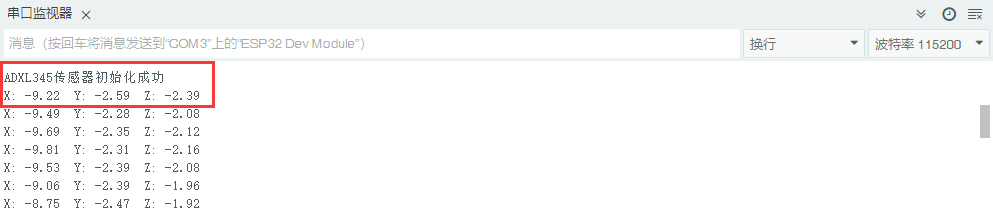 打开串口监督器,复位ESP32开发板,若传感器正常,接线无误,则会打印出ADXL345初始化乐成,并读取到X、Y、Z三轴的加速率值,摇摆传感器数值会发生相应变化。若传感器或接线不正常,则会打印出提示无法找到ADXL345传感器。