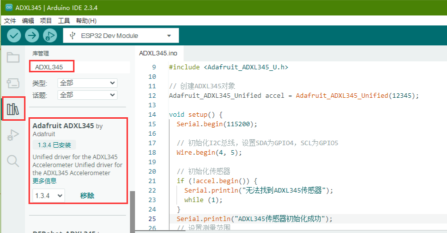 Arduino IDE库管理器中搜刮安装如图Adafruit ADXL345库,会一并安装好相关依赖库Adafruit BusIO,Adafruit_Sensor和Adafruit_ADXL345_U库,或单独搜刮安装依赖库。