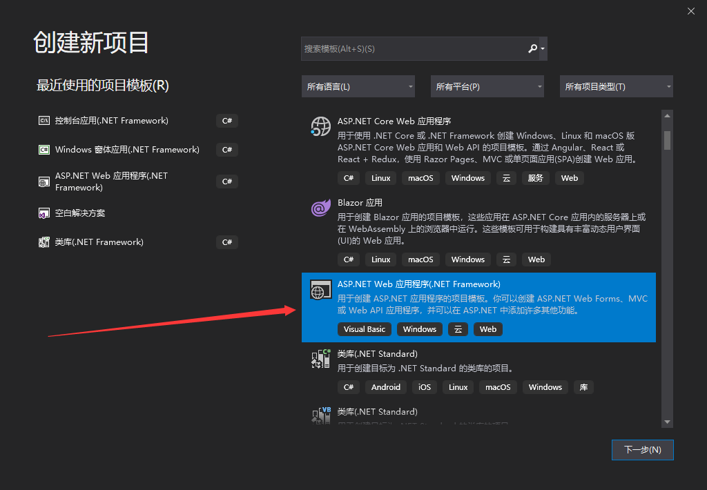 以下界面则与新使用的新建界面一致:选择ASP.NET Web,点击下一步
