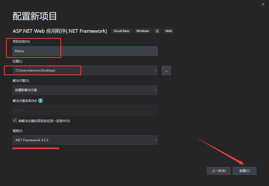 填写项目名称,选择项目存放的位置,选择框架,点击创建