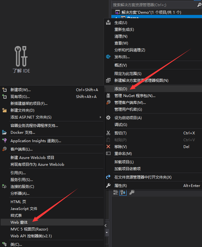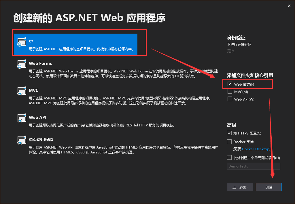 在这里选择一个空的项目,然后一定要勾选右边的Web窗体选项,然后点击创建