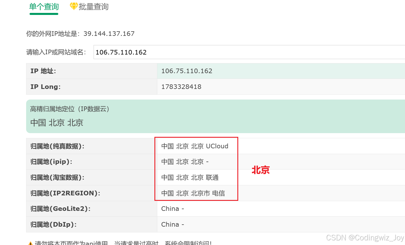 查抄都是北京,以是真实ip应该是106.75.110.162