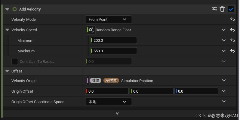 From Point(从点向外扩散)粒子从指定的点(Velocity Origin)向外发射,方向是从该点指向粒子位置的向量。速率巨细 由 Velocity Speed 控制。(爆炸、黑洞推力、能量打击波)