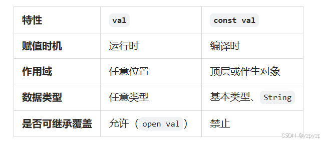运行时赋值:val 的值可以在运行时确定(比方通过函数调用或构造函数参数)。