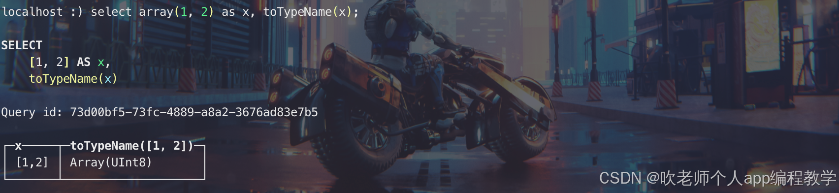 利用方括号- select [1, 2] as x, toTypeName(x);