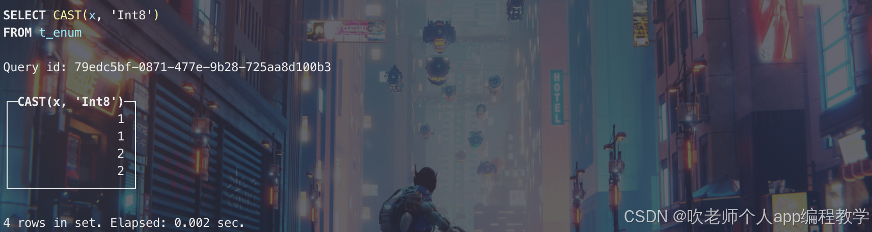 复制代码 假如必要看到对应行的数值,则必须将Enum值转换为整数范例:- select cast(x,'Int8') from t_enum;