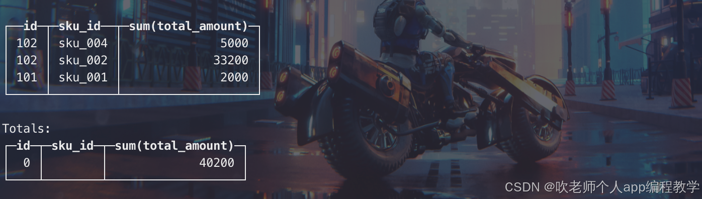 with totals: 只盘算合计- select id,sku_id,sum(total_amount) from t_order_mt