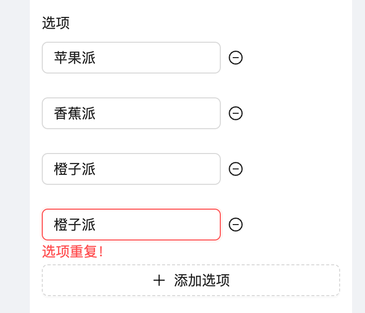 解释代码运行时间,当用户添加选项,输入选项值时后,哪怕值与之前选项不重复,它会保持报“选项重复!