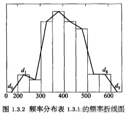 用 d 1 , ⋯ , d k d_1, \cdots, d_k d1,⋯,dk 体现频率分布直方图中各矩形上边的中点,在直方图的左边延伸出一个分段,其重点用 d 0 d_0 d0 体现;在右边延伸出一个分段,其重点用 d k + 1 d_{k+1} dk+1 体现。将 d 0 , d 1 , ⋯ , d k , d k + 1 d_0,d_1,\cdots,d_k,d_{k+1} d0,d1,⋯,dk,dk+1 用折线链接,得到了频率折线图。频率折线图也反映出数据频率的分布规律。