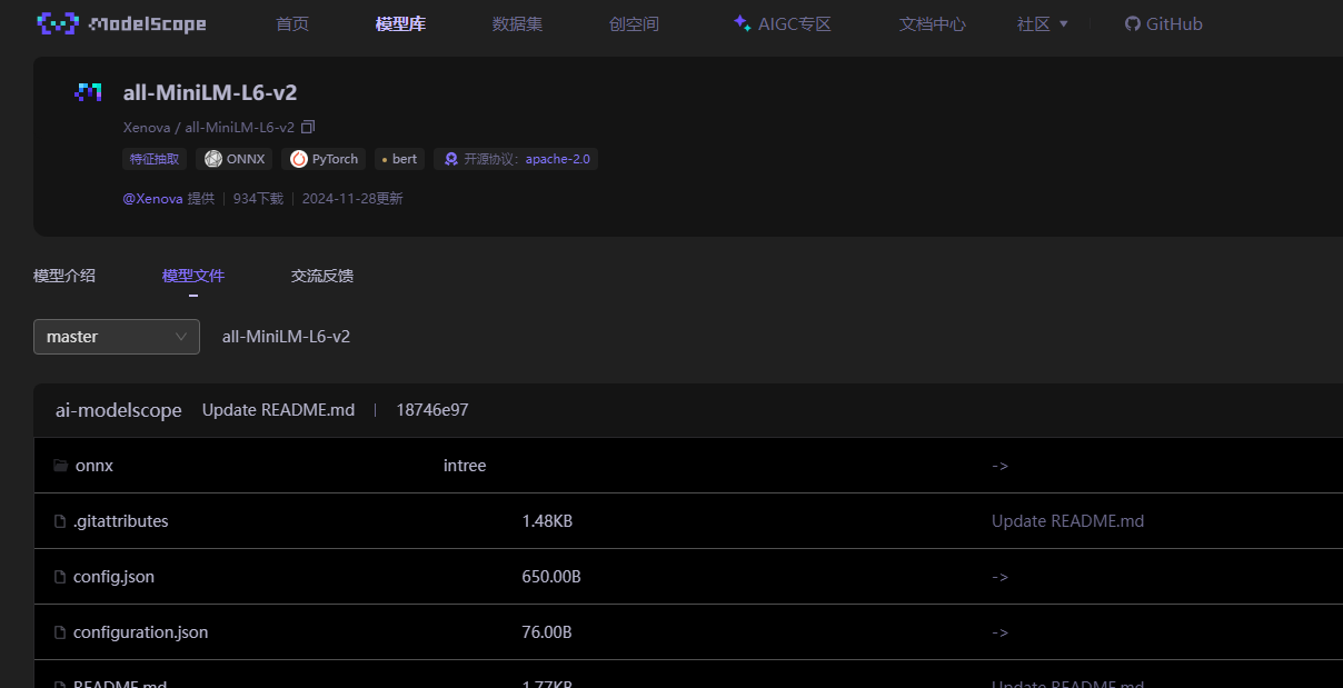 ModelScope上面也维护了 Xenova/all-MiniLM-L6-v2 的模子文件, 地点是: