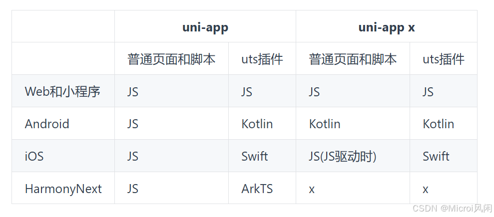 可以通过表格更清楚的相识 uts 语言在 uni-app 和 uni-app x 下的编译关系。