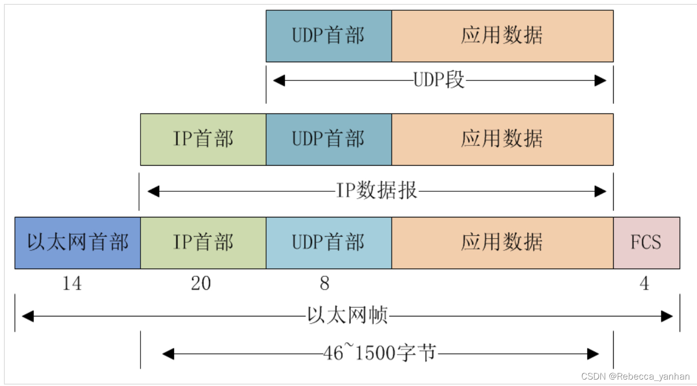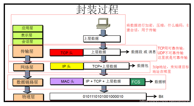 - 传输层(TCP):添加TCP头(端标语、序列号),封装为TCP段。