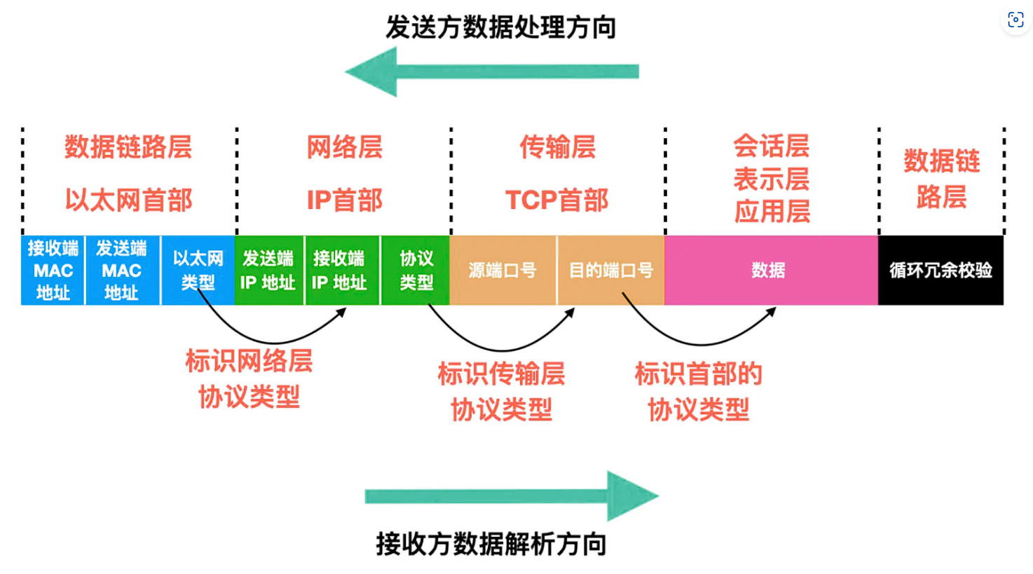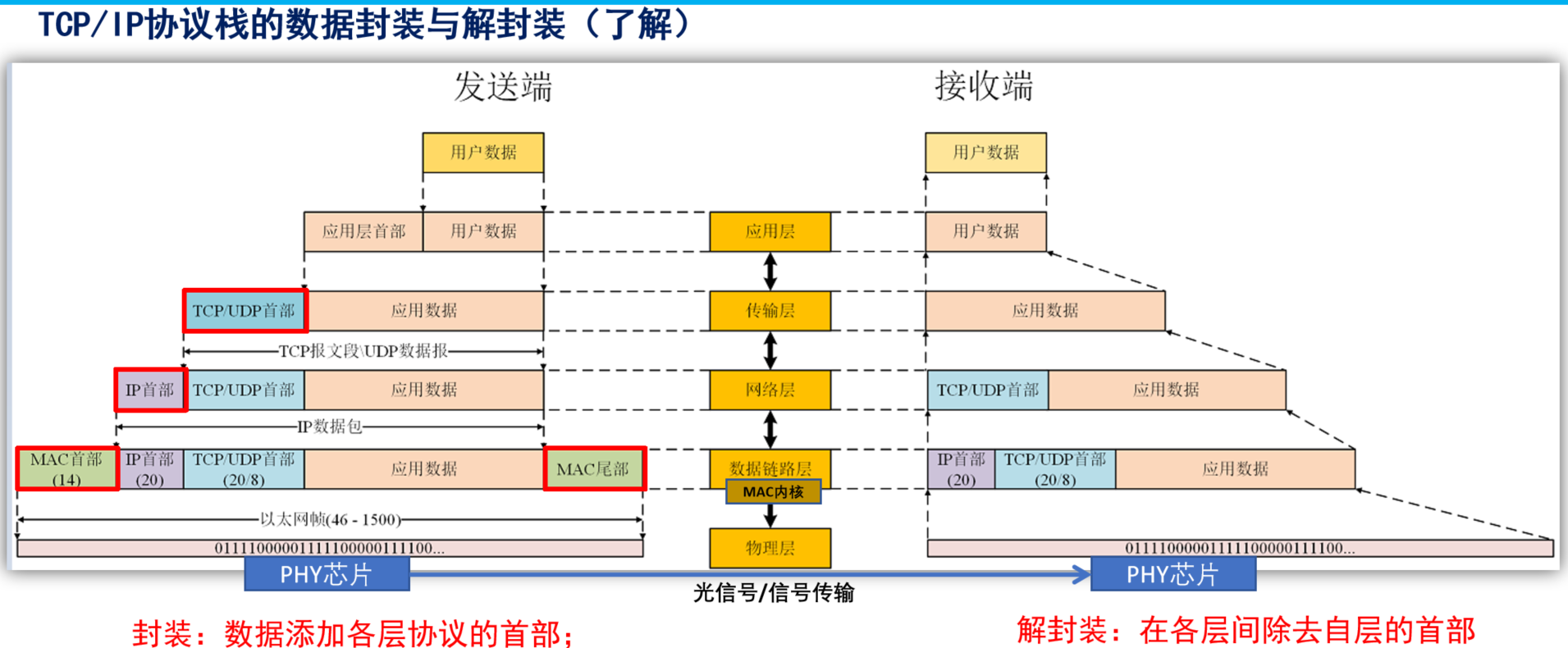 - 网络接口层(Ethernet):添加MAC头(源/目标MAC所在)和CRC校验,形成以太网帧,通过物理层发送。