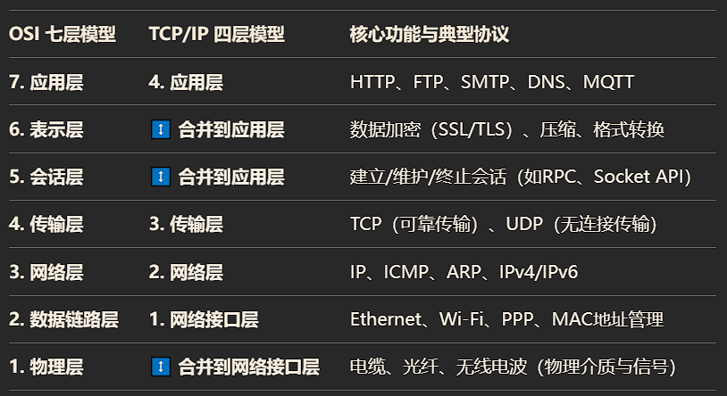 - TCP/IP 模子:源于互联网实际发展,简化分层(四层),直接对应实际协议(如TCP、IP),是互联网的究竟标准。