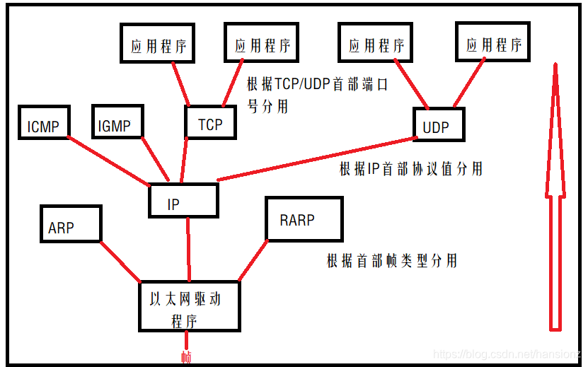- 数据分用:下一层向上一层交付数据,以太网驱动步伐根据MAC协议将报头和有效载荷分离,根据首部中所包罗上一层的协议决定交付给上一层谁,其他层也是一样的。