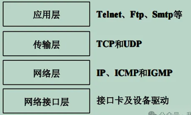 - 如应用层(HTTP/FTP/...)、传输层(TCP/UDP)、网络层(IP/ICMP/ARP)、网络接口层(以太网/WiFi/PPP)