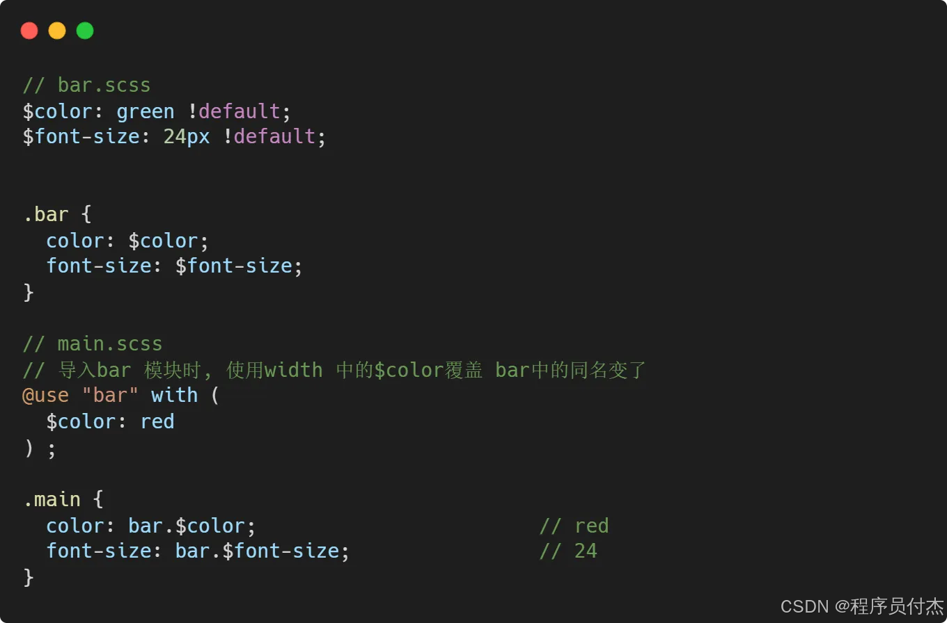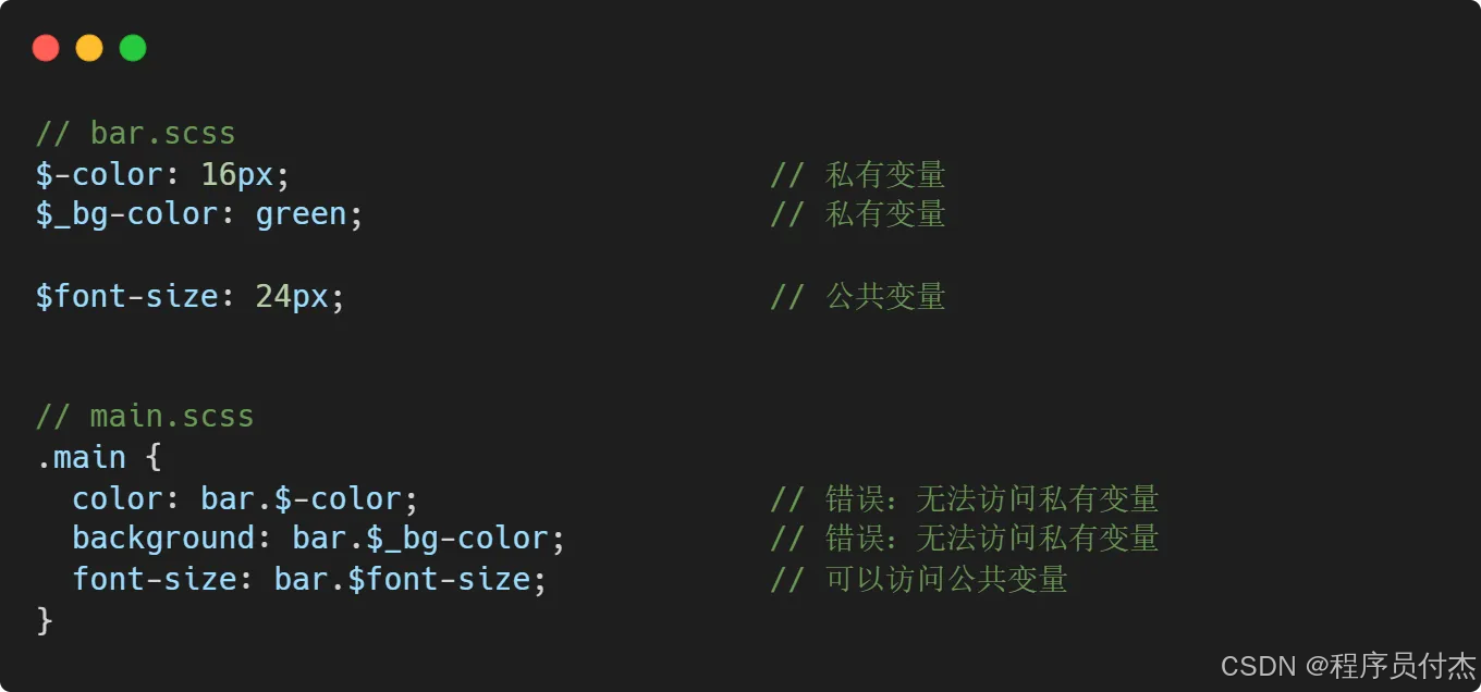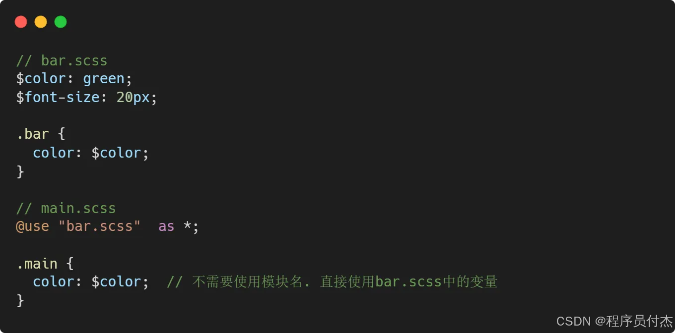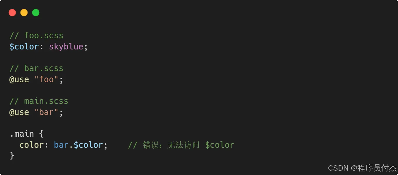 如果 main.scss 引入了bar.scss,而 bar.scss 又引入了 foo.scss,main.scss 并不会自动得到访问 foo.scss 中变量的权限。这是为了确保模块的封装性,克订定名辩说和不测的依赖耦合。