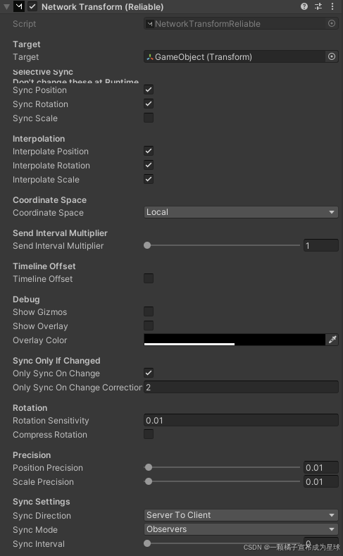参数分析Target目的对象的 Transform 组件(需指定具体的 GameObject)Sync Position启用位置同步(同步 XYZ 坐标)Sync Rotation启用旋转同步(同步四元数或欧拉角)Sync Scale启用缩放同步(同步缩放比例)Interpolate Position对位置举行插值盘算,实现平滑移动Interpolate Rotation对旋转举行插值盘算,实现平滑转向Interpolate Scale对缩放举行插值盘算,实现平滑缩放Coordinate Space坐标空间(当前为 Local,纵然用本地坐标系)Send Interval Multiplier发送隔断倍数(调解同步频率,值越大发送隔断越长)Timeline Offset时间线偏移(用于校准网络延长与本地时间轴)Show Gizmos在场景视图中表现调试辅助线(如位置/旋转轴)Show Overlay在游戏视图中表现覆盖层标志同步对象Overlay Color覆盖层颜色(自界说调试标志的表现颜色)Sync Only If Changed仅在属性发生变更时触发同步(节省带宽)Rotation Sensitivity旋转敏感度(阈值 0.01,旋变革化凌驾此值时触发同步)Compress Rotation压缩旋转数据(淘汰旋转同步的带宽占用)Position Precision位置同步精度(阈值 0.01,低于此值的坐标变革将被忽略)Scale Precision缩放同步精度(阈值 0.01,低于此值的缩放变革将被忽略)Sync Direction同步方向(当前为 Server To Client,即服务端权势巨子模式)Sync Mode同步模式(当前为 Observer,即观察者模式)Sync Interval同步隔断(当前为 0,表现利用底层网络框架的最小隔断时间) 4、同步机制