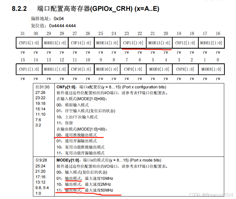 因此控制这个IO口我们选择0011 (通用推挽输出模式速率50HZ) 即我们赋值寄存器