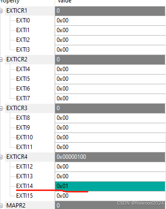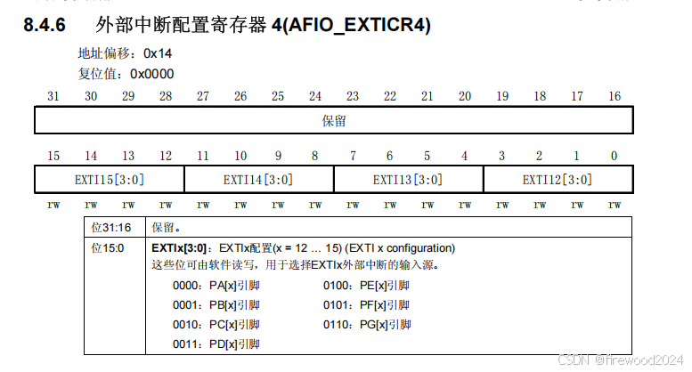 外部克制设置寄存器 1~4(AFIO_EXTICR1) 外部克制设置寄存器共4个,pb14使用的是第4个 AFIO_EXTICR4 由于是设置PB14因此控制的是8-11 EXTI14[3:0]位共4位控制位,由于是GPIOB 因此这4位是 0001 =0x01