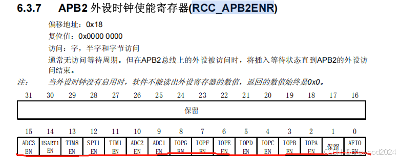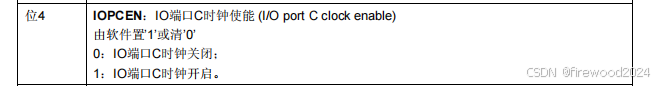 - 第一步:假设要是能PC13使其输出高电平,经查得知PC13是GPIOC的编号13的IO口(按照次序因该是第14位IO,是从0开始编的)以是第一步使能能APB2外设总线时钟寄存器