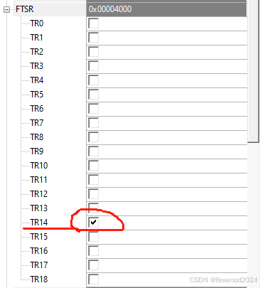 FTSR(Falling edge Trigger Selection Register) 我们设置是bit14位因此须要设置为1