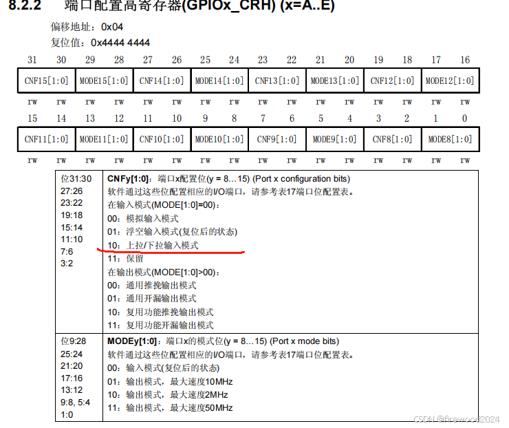 可以看到0100代表的是浮空输入模式,即STM32上电后的复位状态都是浮空输入模式。