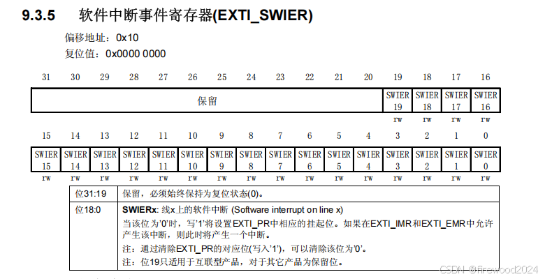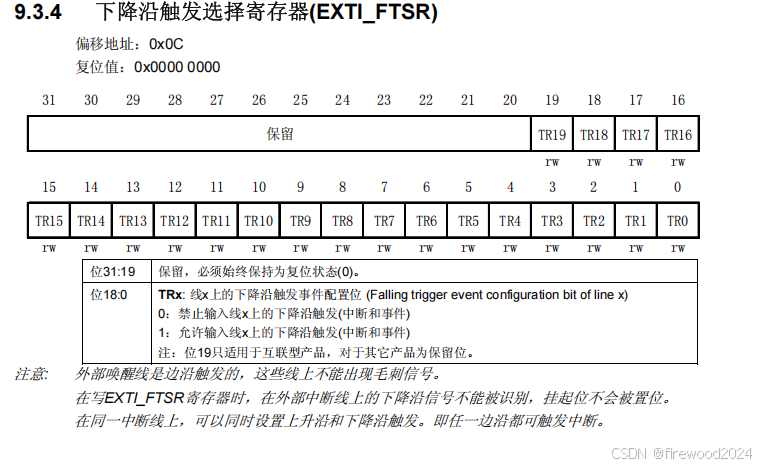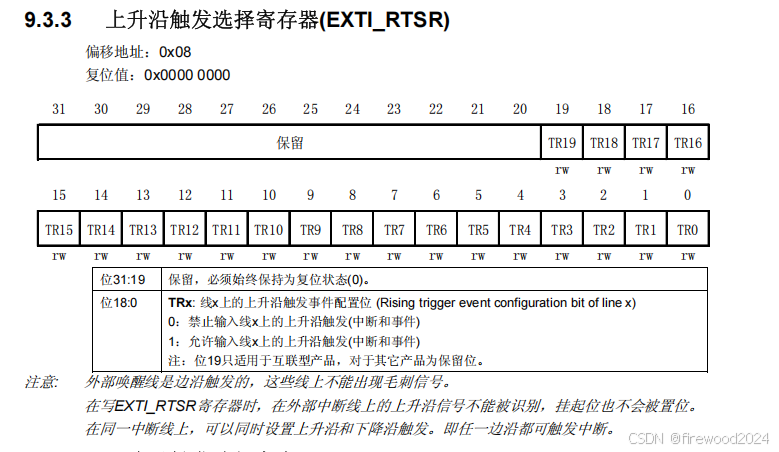 ● 设置所选克制线的触发选择位 (EXTI_RTSR 和 EXTI_FTSR) ; RTSR(Rising Trigger Selection Register),我们选择的是降落沿因此无需设置即默认。