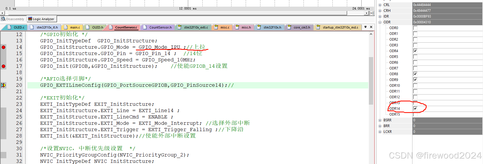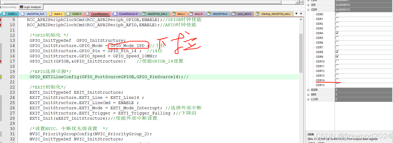 输入模式下的上拉电阻和下拉电阻寄存器设置 由GPIOx_ODR寄存器控制,为0则为下拉,为1则为上拉。ODR寄存器原先是数据输出寄存器。由上述的两图可以看到当设置为GPIO_Mode_IPU;时ODR14为1,下拉时为0.