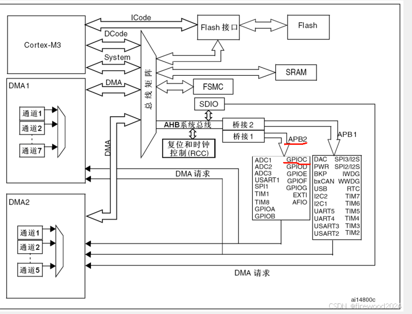 - 与AHB的区别:AHB是高级高性能总线,重要用于毗连高性能模块如CPU、DMA和高速存储器。APB2则是用于毗连低速外设。