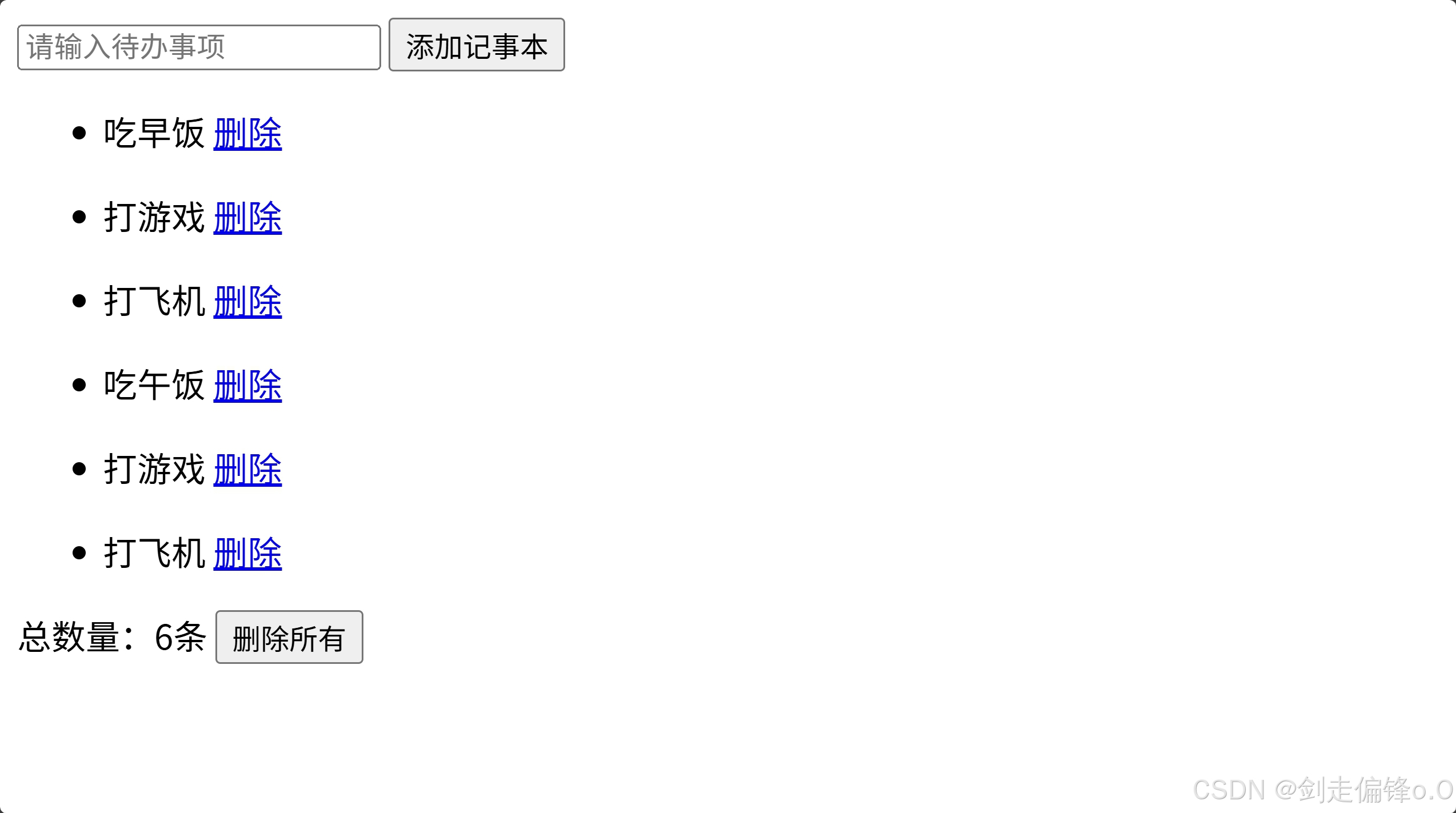 - 变乱绑定:使用 @click 绑定点击变乱,比方添加事项、删除事项和清空全部事项的功能。