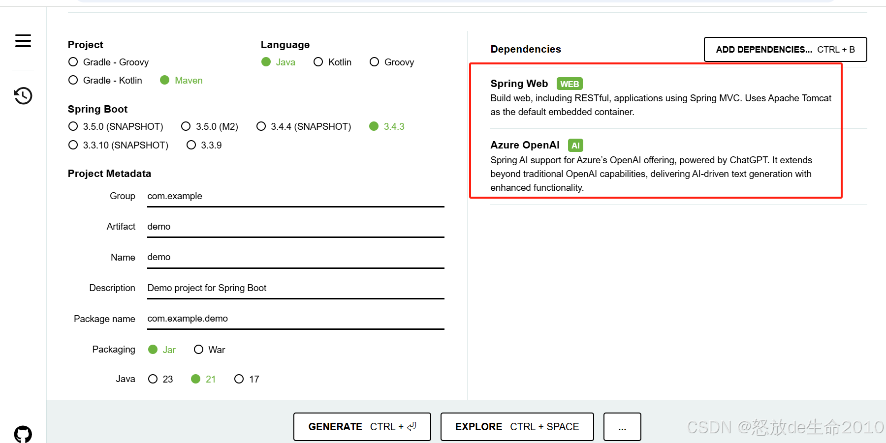 天生一个Spring Boot项目并设置相干的pom.xml依赖,使用spring-boot-starter-web和spring-ai-azure-openai-spring-boot-starter作为焦点依赖。项目还使用了spring-ai-bom来管理版本。
