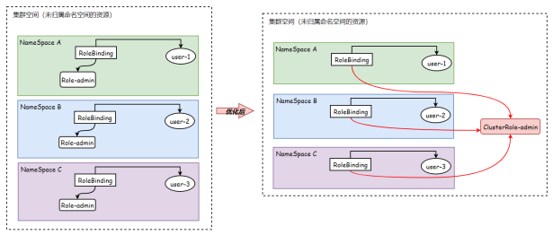 但是: 我们可以界说一个clusterrole,然后通过rolebinding绑定就完成了,,也就不必要重复创建很多的role