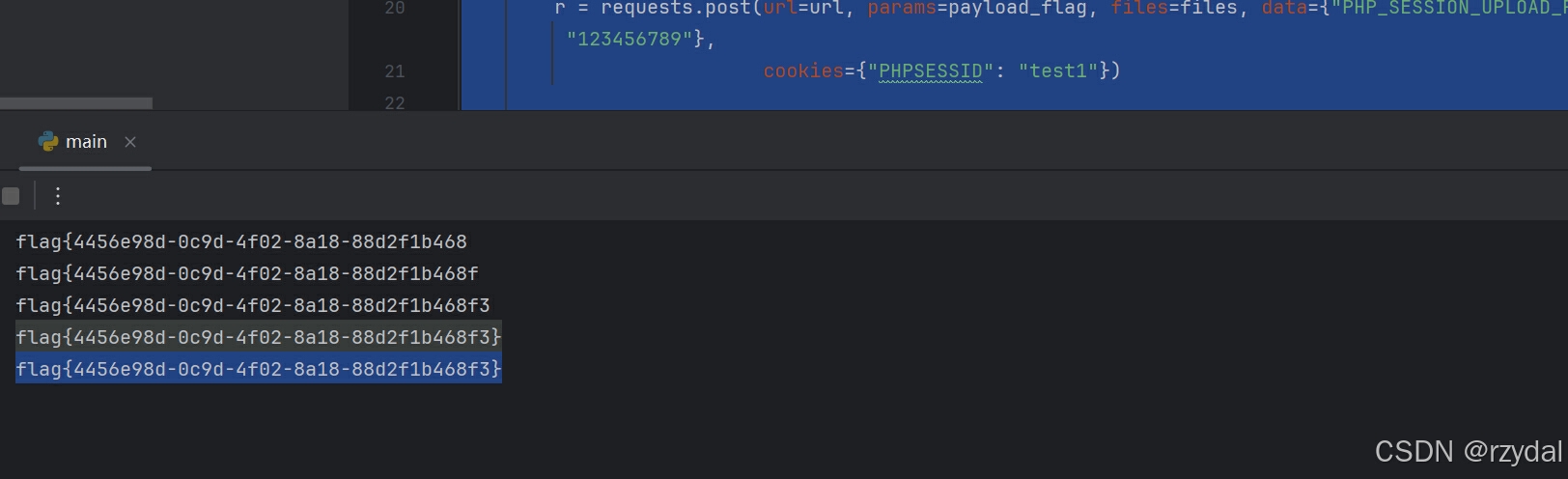 - r = requests.post(url=url, params=payload_flag, files=files, data={"PHP_SESSION_UPLOAD_PROGRESS": "123456789"},