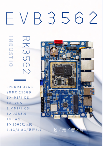 (型号EVB3562),基于瑞芯微新一代Soc RK3562/RK3562J计划,可用于轻量级人工智能应用。EVB3562开辟板配备了PCIe2.1/USB3.0 OTG/千兆网口等各范例接口,支持4G/5G通讯、多摄像头及多种视频接口,可应用于