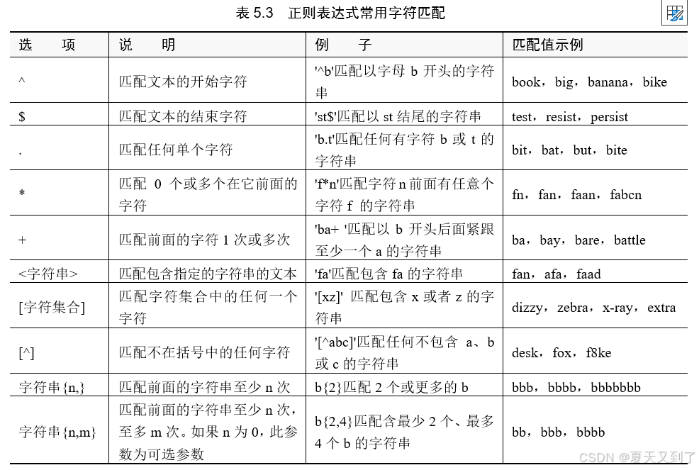 MySQL中利用REGEXP关键字指定正则表达式的字符匹配模式。表5.3列出了REGEXP操纵符中常用的字符匹配。