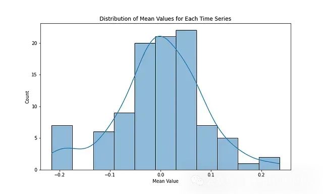 - ")["value"].apply(mean) print("\nCustom features (mean of each time series, first 5):") print(custom_features.head()) # 特性分布可视化 plt.figure(figsize=(10, 6)) sns.histplot(custom_features, kde=True) plt.title('Distribution of Mean Values for Each Time Series') plt.xlabel('Mean Value') plt.ylabel('Count') plt.savefig("dist_of_means_TS.png") plt.show()