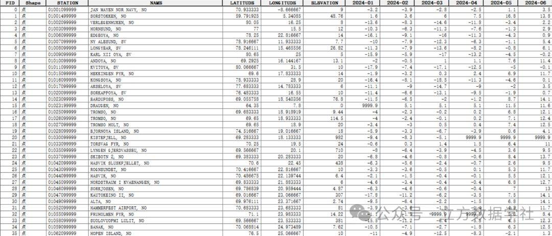 Shp格式数据的具体属性和Excel数据雷同,我们以2024年景象站点的每月均匀气温数据为例来预览一下: