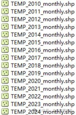 该数据提供Shp和Excel两种数据格式,由于是逐月均匀气温数据,又有96个年份,数据条数非常多,难以将全部年份生存在一个文件中。我们将每一年的数据生存为一个Shp文件和一个Excel文件,一共有96个年份,也就是有96个Shp文件和96个Excel文件。