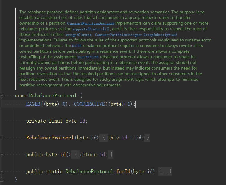 CooperativeStickAssignor是2.4版本开始提供的,使用的cooperative协议,在sticky的基础上,优化rebalance过程,可以从RebalanceProtocol源码中看到这两个协议的解释:
