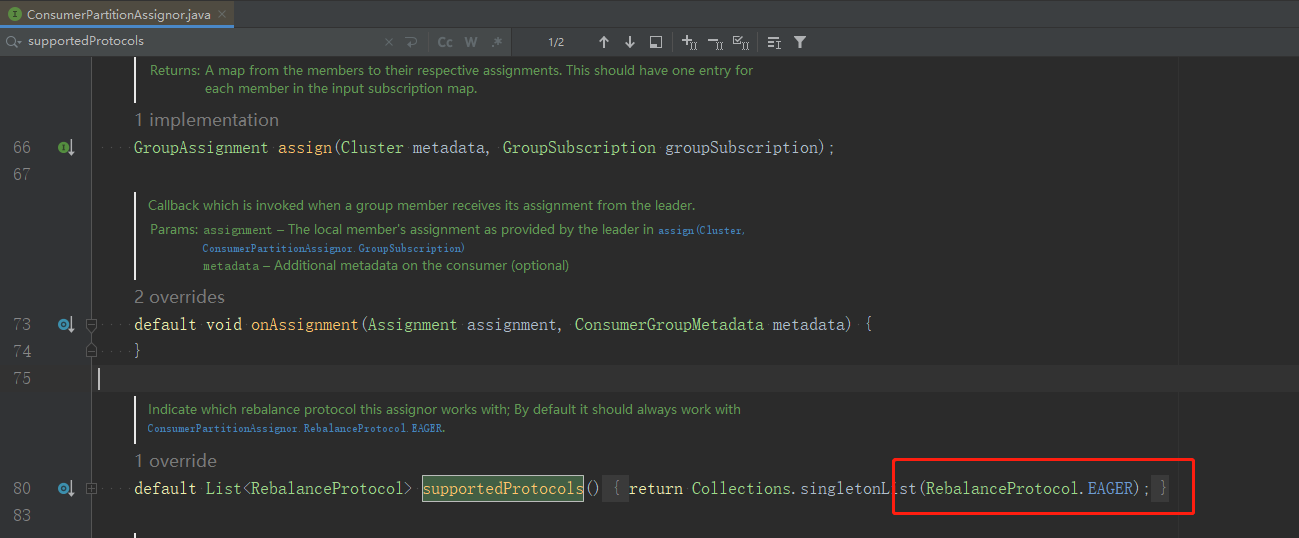 ConsumerPartitionAssignor接口默认就指定了eager协议,如图: