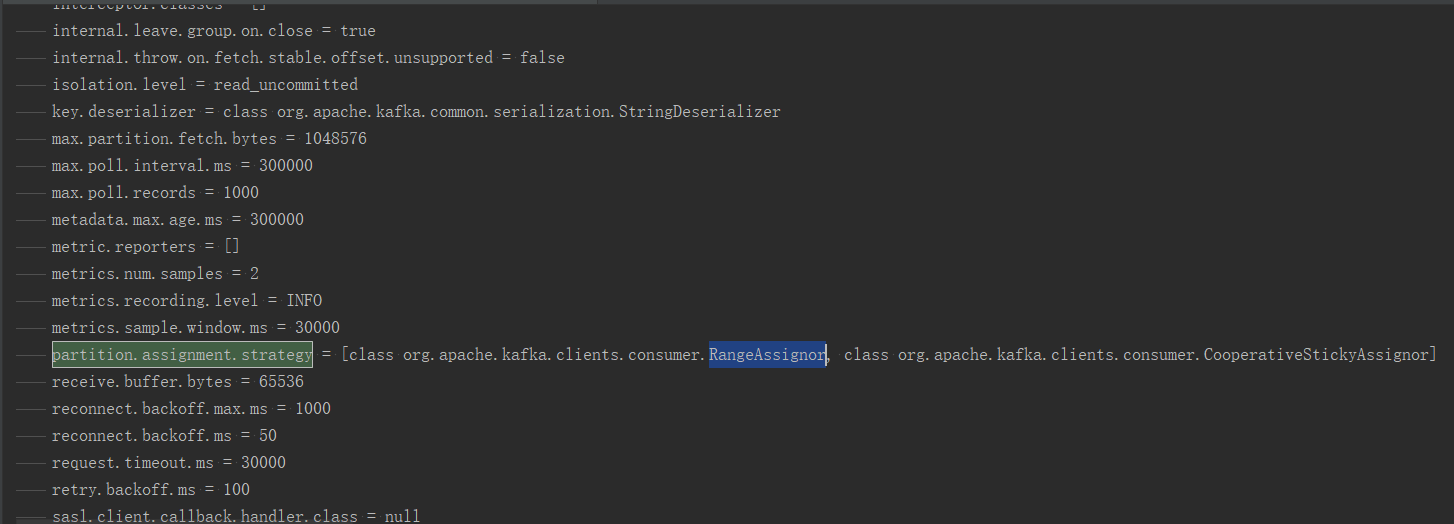 这4种分区分配策略是可以配置的,客户端通过partition.assignment.strategy参数进行设置,默认是RangeAssignor。