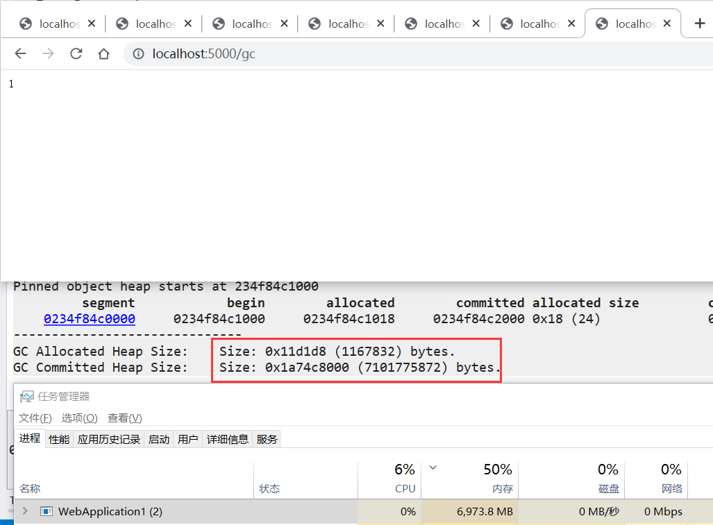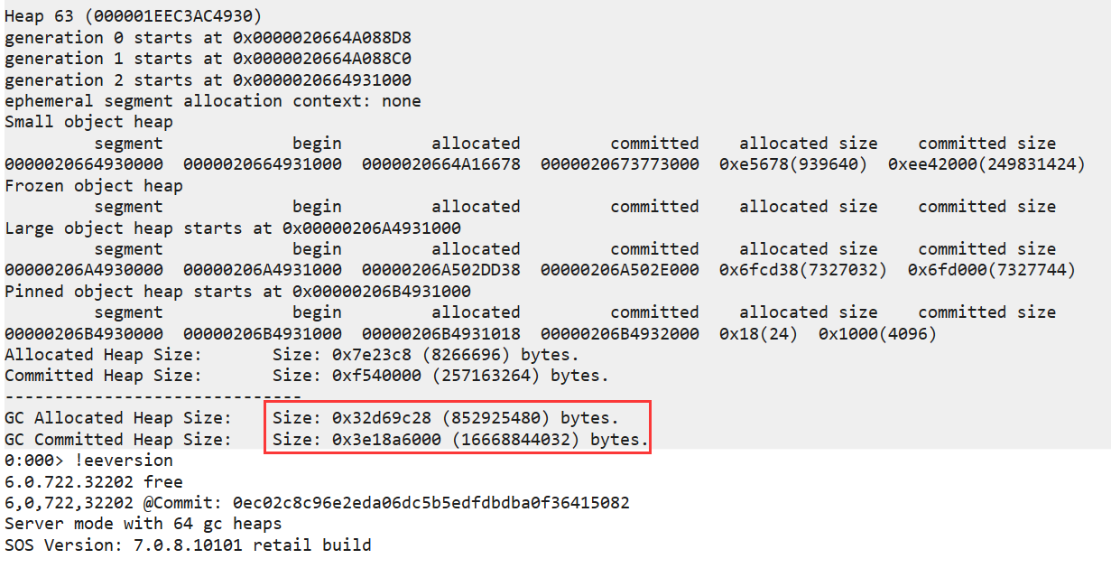 从卦中看,我当前请求了 6 次,内存峰值达到了 12G,因为是临时对象,稍稍有一点回落,但此时已经撑成一个大胖子了,接下来我们用 WinDbg 附加一下,观察下 Allocated 和 Committed 阈值。- 0:033> !eeheap -gc