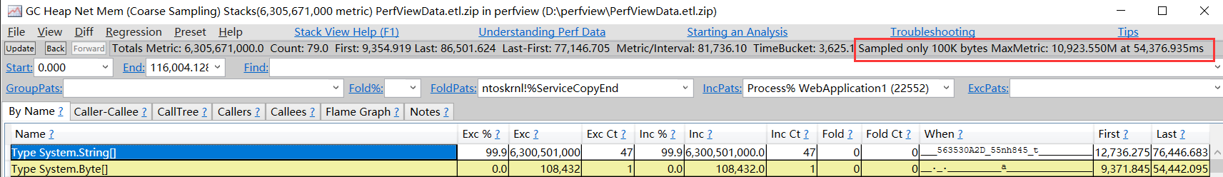 复制代码 采集一段时间后停止采集,接下来双击 GC Heap Net Mem (Coarse Sampling) Stacks 选项再选择 WebApplication1 进程,通过 MaxMetric 指标看到曾经峰值达到了 10.9G,截图如下: