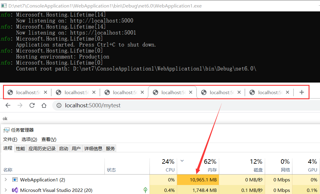 复制代码 代码非常简单,每请求一次 /mytest 都会分配一个 1亿 大小 List 数组,而这个 List 又是一个临时对象,后续会被 GC 回收,接下来我们多请求几次来调戏一下 GC,看他如何痉挛,截图如下: