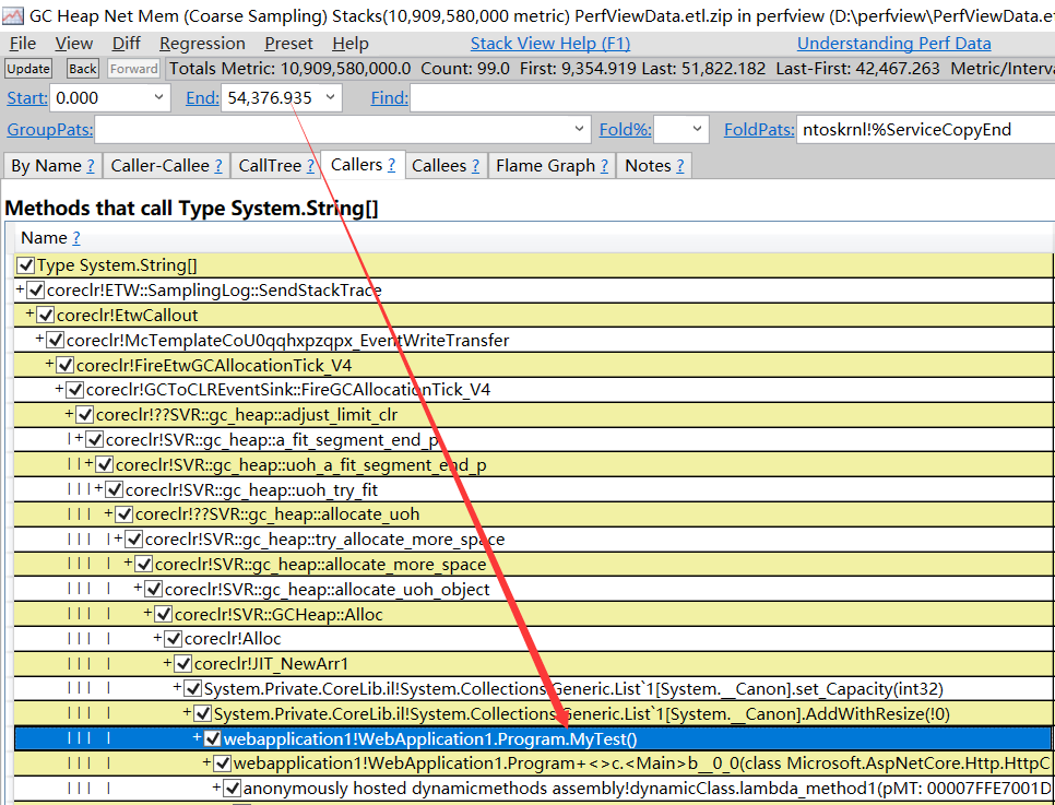毫无疑问的说,内存峰值的时候必有妖怪,可以将峰值填入到 End 文本框中,然后双击内存占比最高的 System.String[],观察下它是谁分配的,截图如下: