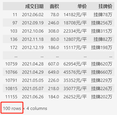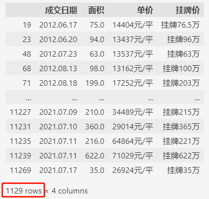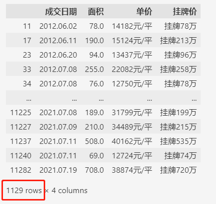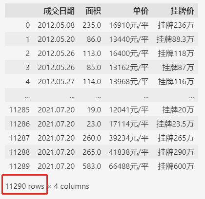 这次示例中准备的数据来自链家网,我采集了一些南京市建邺区的房产交易数据,共有11290条。- import pandas as pd