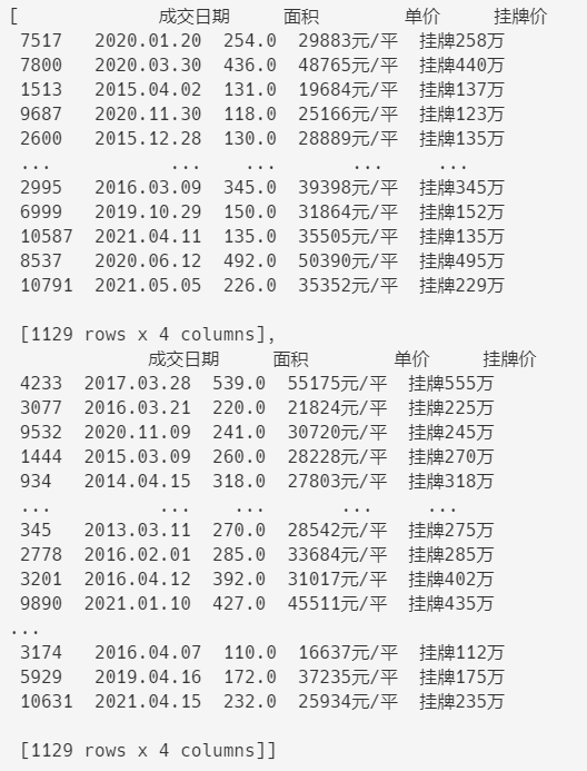 复制代码 比如上面示例的房产成交数据(共11290条),通过此方法可以平均划分成n个数据集。- ds = split_dataset(df, n=10)
