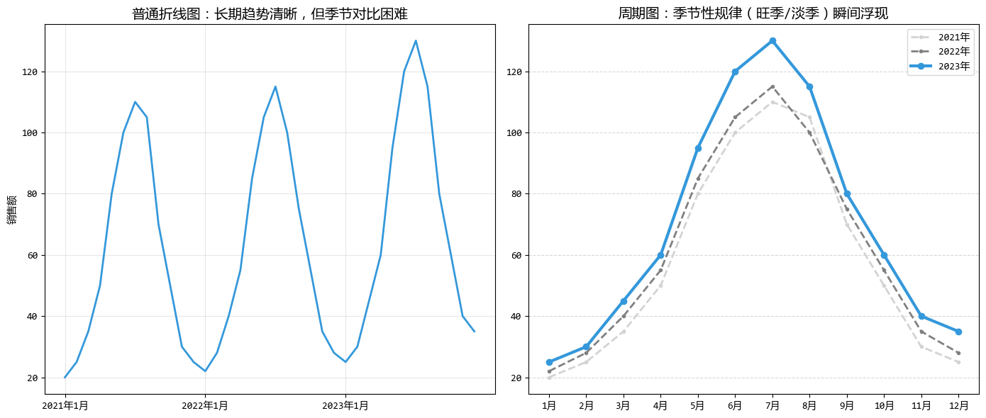 - 右图(周期): 就像把每年的数据“叠”在了一起。你可以直接看到,无论哪一年,7月都是最高峰,而12月都是低谷。规律一清二楚。
